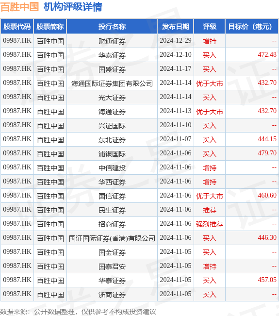 投行对该股的评级以买入为主,近90天内共有10家投行给出买入评级,近90天的目标均价为453.21港元。财通证券最新一份研报给予百胜中国增持评级。